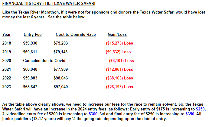 The last two years since Covid, inflation and supply chain issues have triggered a substantial increase in expenses. The TWS also needs to budget in the price increases for unexpected expenses such as legal fees, trademark protection, insurance, website design, a new tracking system for racers, race postponements, etc. The last time the Texas Water Safari had an entry fee increase was in 2018. The following information shows that the current entry fees do not cover the cost of the Texas River Marathon.