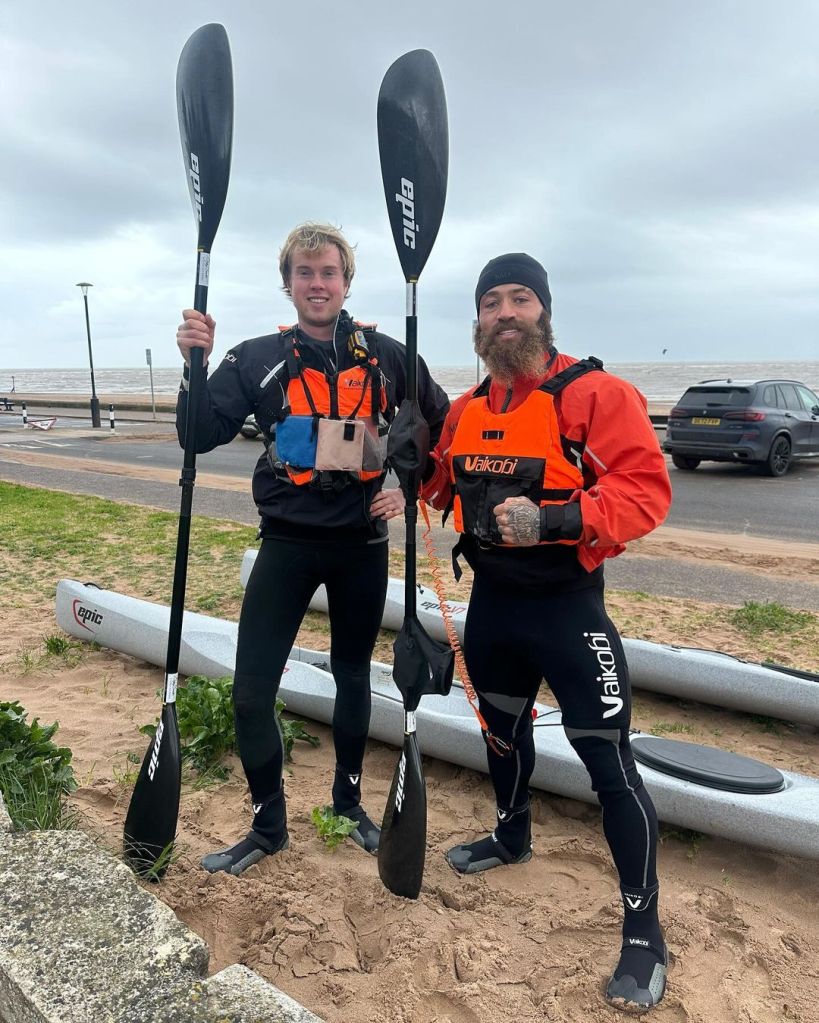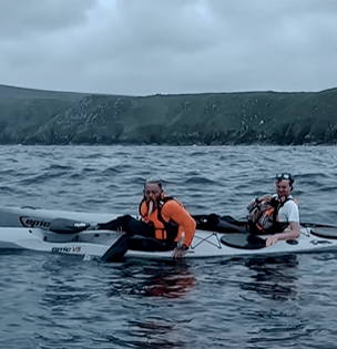 Former pro footballer and reality TV star Ashley Cain leaned over the side of the support rib to vomit. He and Dougal Glaisher were taking turns emptying the contents of their stomachs as they made their way to a GPS point in the sea off the coast from Ravensglass, across from the Isle of Man. The stunning Lake District stretched out to the east, but they were headed up the coast to Scotland. Exactly the opposite of what the wind had in mind. Thrashed by waves that pitched the rib up and down until they hurled, the two paddlers hadn’t even gotten into their surfskis yet. On 30th of June, Dougal had already done 550 miles of paddling from Land’s End. Ashley had done the same, plus 1,825 miles of running and cycling.
