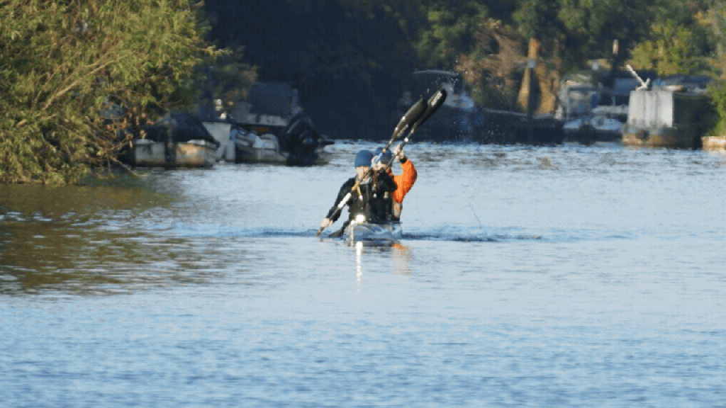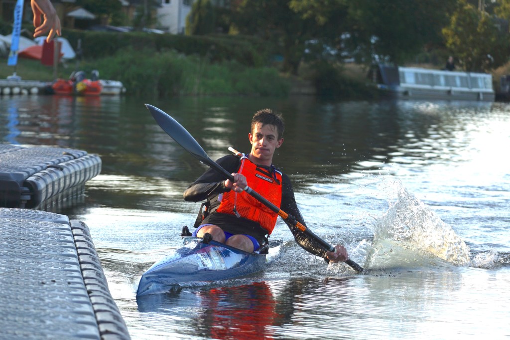 Tonbridge Canoe Club’s relay team arrived next in 18:26:30, just a few minutes before the Rees-Clark siblings who raced all 200 km straight-through: the fastest straight-through finishers in 18:34:13. They hung with the Tonbridge team for most of the race once they realised how well-matched they were in speed. Not only did the Rees-Clark siblings finish fifth-fastest overall and faster than most (seven) relay crews, they also finished in absolutely perfect form. Every time the Paddle Daily crew spotted the Rees-Clark siblings on the water, they were in perfect time. They looked exactly how they did at the start. Almost every other straight-through crew (and many relay crews) arrived at the finish with the sort of form that says ‘I’ve just paddled 200 km, all I care about is getting to the finish line and minimising the pain where I can.’ That may well be how the Rees-Clarks felt, but watching from the riverbank, it looked perfect.