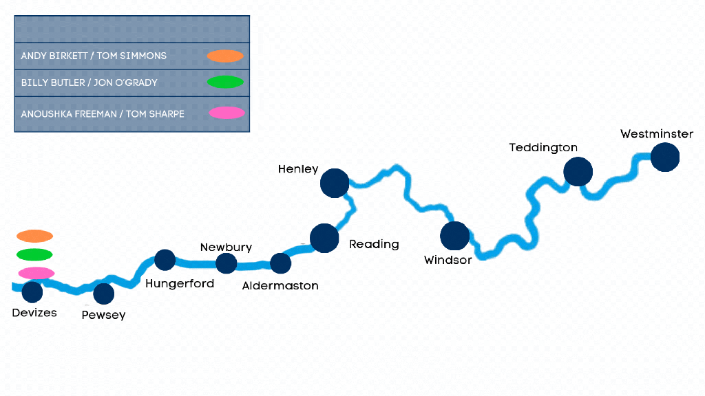 There are four top contenders to win this year’s Devizes to Westminster race: Tom Sharpe / Anoushka Freeman, Brynde Kreft / Joe Petersen, Tom Simmons / Andrew Birkett, and Dan Palmer / David Horkan. Tom and Noushie could arguably be the favourites coming after their win last year, but Brynde / Joe will certainly be challenging them from the mixed side and Tom / Andy from the men’s side. Tom / Andy are quicker on the water; they’re making adjustments to their training and boat set-up to improve their chemistry; and they’re out for redemption after retiring from DW 2024 early. So by the data, all Tom / Andy have to do is finish all 125 miles at a fairly comfortable pace, and they should take the win. But as we saw last year (and as any ultra marathon paddler knows), the data is never a guarantee.