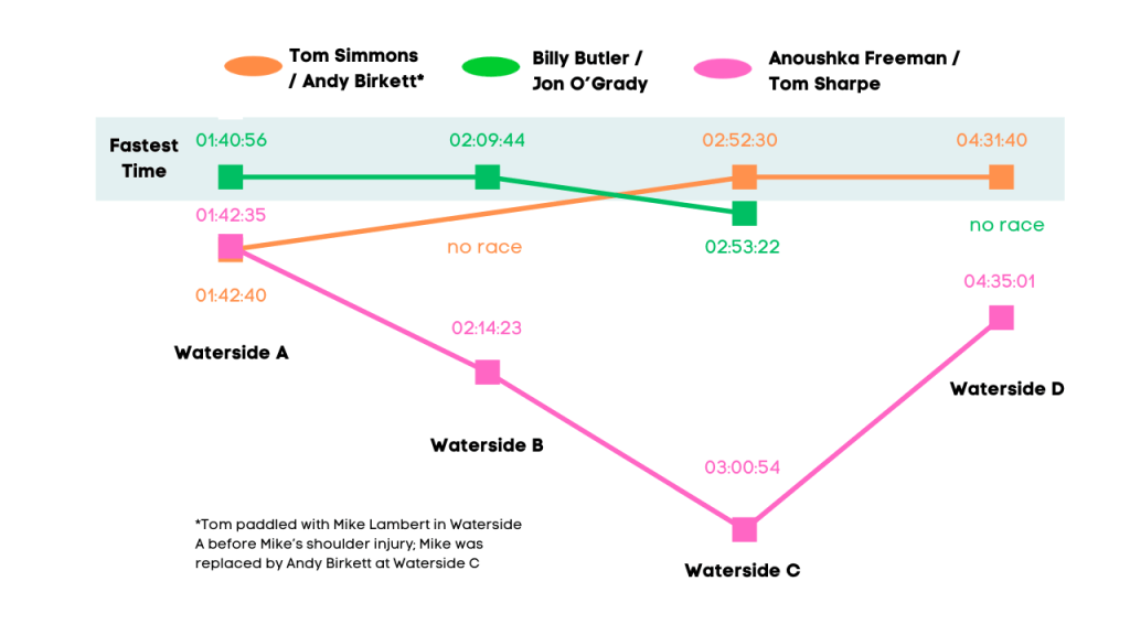 Looking at the Waterside Series data from 2024, and each top crew’s time past the first few checkpoints during DW itself, Tom / Andy absolutely have the boat speed. But it was Tom / Noushie whose boat chemistry, fast flow experience, and persistent endurance kicked in after Newbury and ultimately took them to first place.