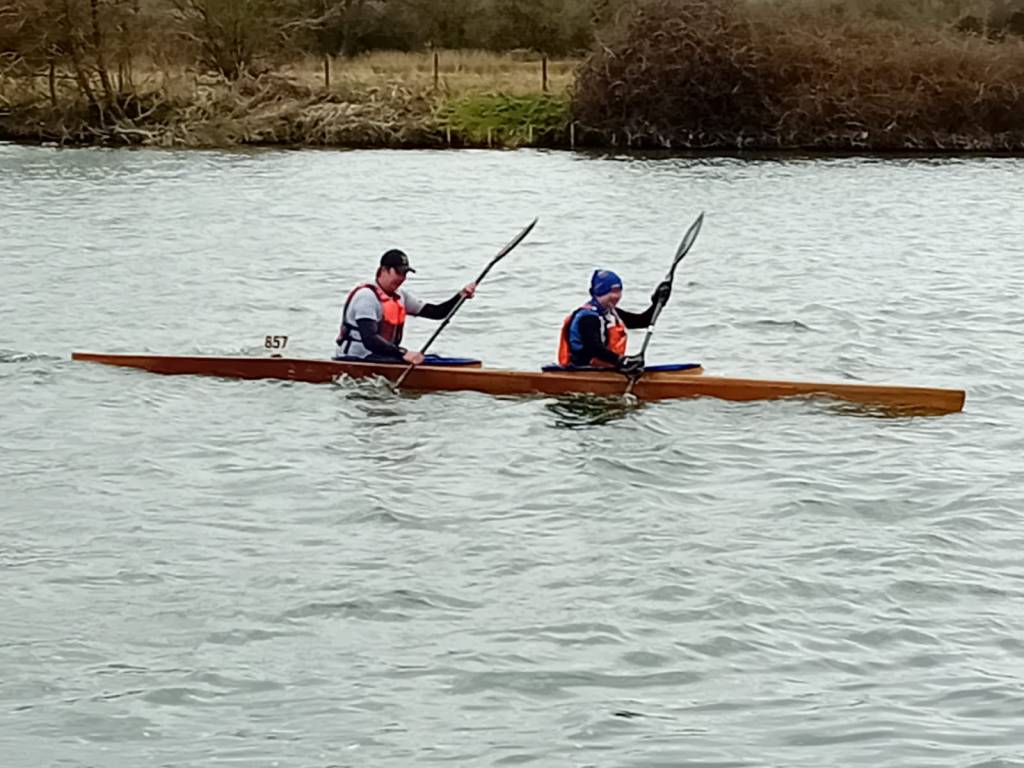 In their second race together, Joe Petersen / Brynde Kreft paddled to an easy win in the mixed K2 class, and a hard-earned 4th fastest K2 overall. They finished one second ahead of the second place men’s K2 of Jordan Martyn / Edward Saunders from Wey Canoe Club, and behind three men’s and boys crews who continued their dominant streak this season: the leading men’s crew Tom Simmons / Andrew Birkett, the record breaking junior boys crew of Will Short / Alex Worgan, and last year’s U16 national marathon K2 champs Freddie Heard / Olivier Mazur. Although Joe and Brynde were happy to get a clean run after their rudder incident at Waterside B, they ran into a different boat issue when they got swamped in the whitecaps at Henley straight.