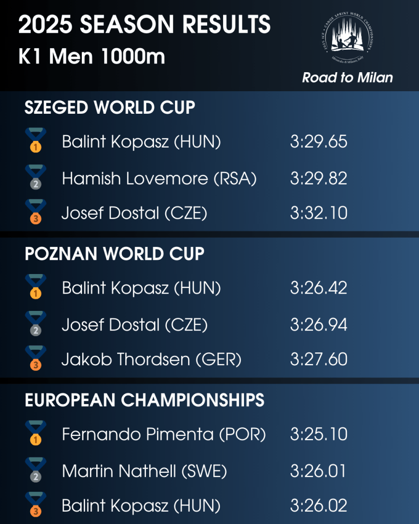 The men’s Olympic distance should theoretically be less open than the women’s race, as the entire A final from the Paris Olympics are signed up to race in Milan. But South African multidisciplinary paddler Hamish Lovemore proved in Szeged that it’s still possible for someone else to break through. At the World Cup in May, Lovemore stunned paddling fans when he took silver in 3:29.82, just 0.17 seconds behind Hungarian Balint Kopasz. He was more than two seconds ahead of reigning Olympic champion Josef Dostal (Czechia).
