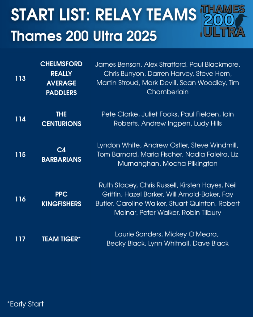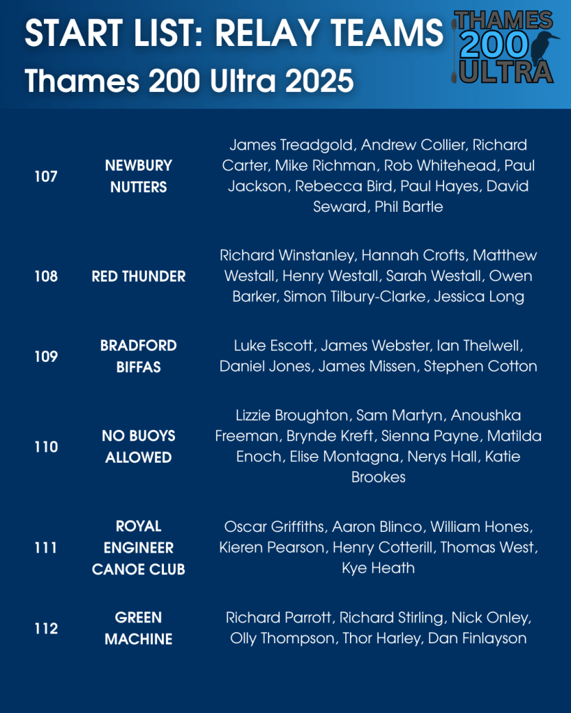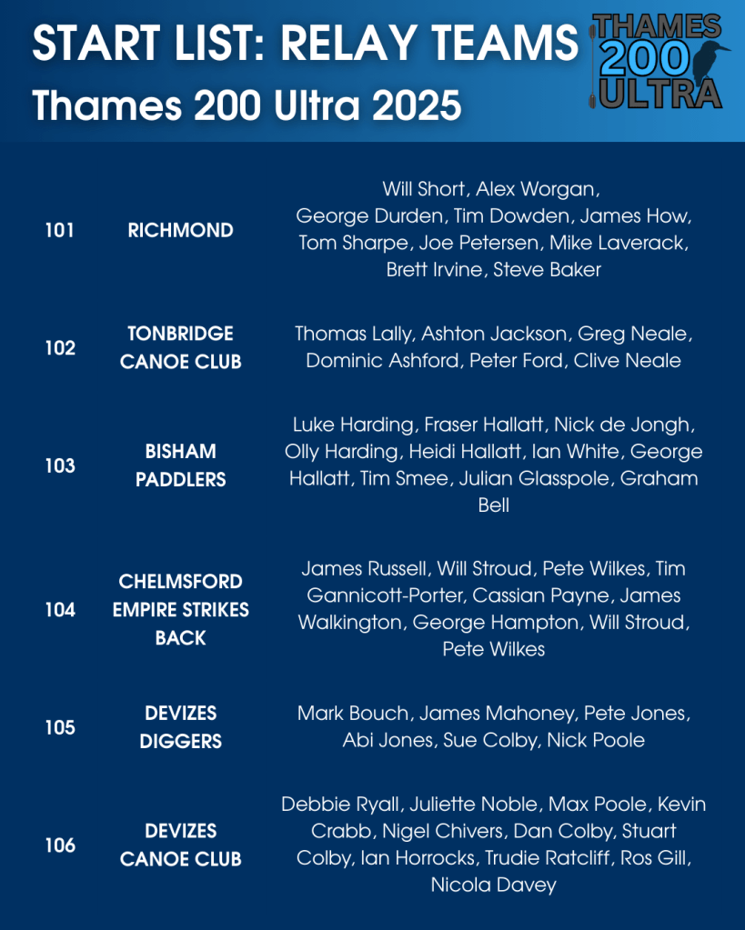With 17 relay teams entered this year, the racing behind the top teams could be just as exciting. These teams feature even more previous DW racers and winners including Olly Harding and Ian White, who held the DW record for about 30 seconds in 1979 before Brian Greenham / Tim Cornish swooped in. Olly and Ian will be racing with Team Bisham Paddlers. The cross-pollination between Devizes to Westminster and Thames 200 Ultra doesn’t stop there though: the DW Race Director himself, Paul Fielden, is racing for The Centurions. DW Chairman of Directors James Treadgold has joined in too, racing for the Newbury Nutters.