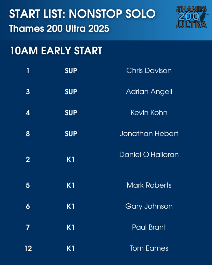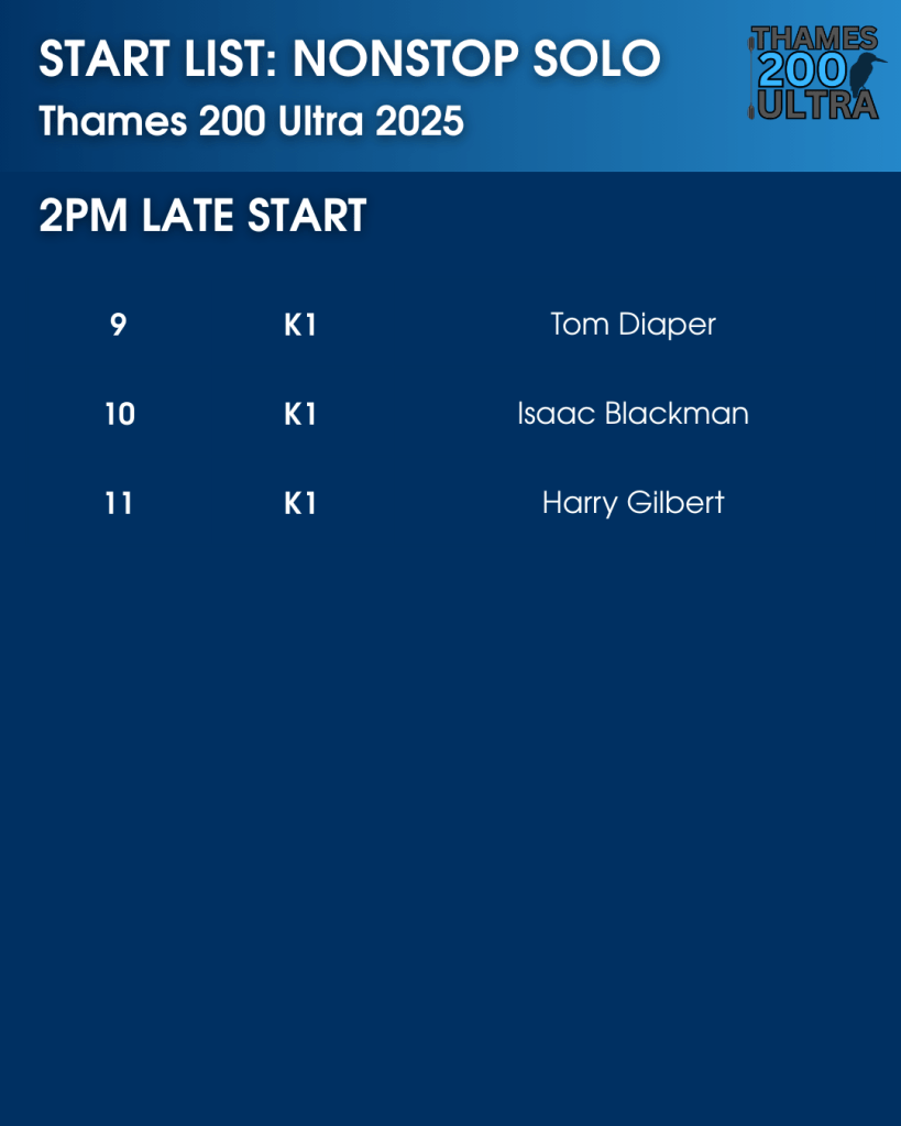Only 3 solo non-stop paddlers will start at 2pm, and it’s the three most likely candidates to win: Tom Diaper, Isaac Blackman, and Harry Gilbert. All three are in Division 3 and above in the UK marathon ranking system (1 to 9 where 1 is the fastest), so the differentiation might come from their experience with ultras.