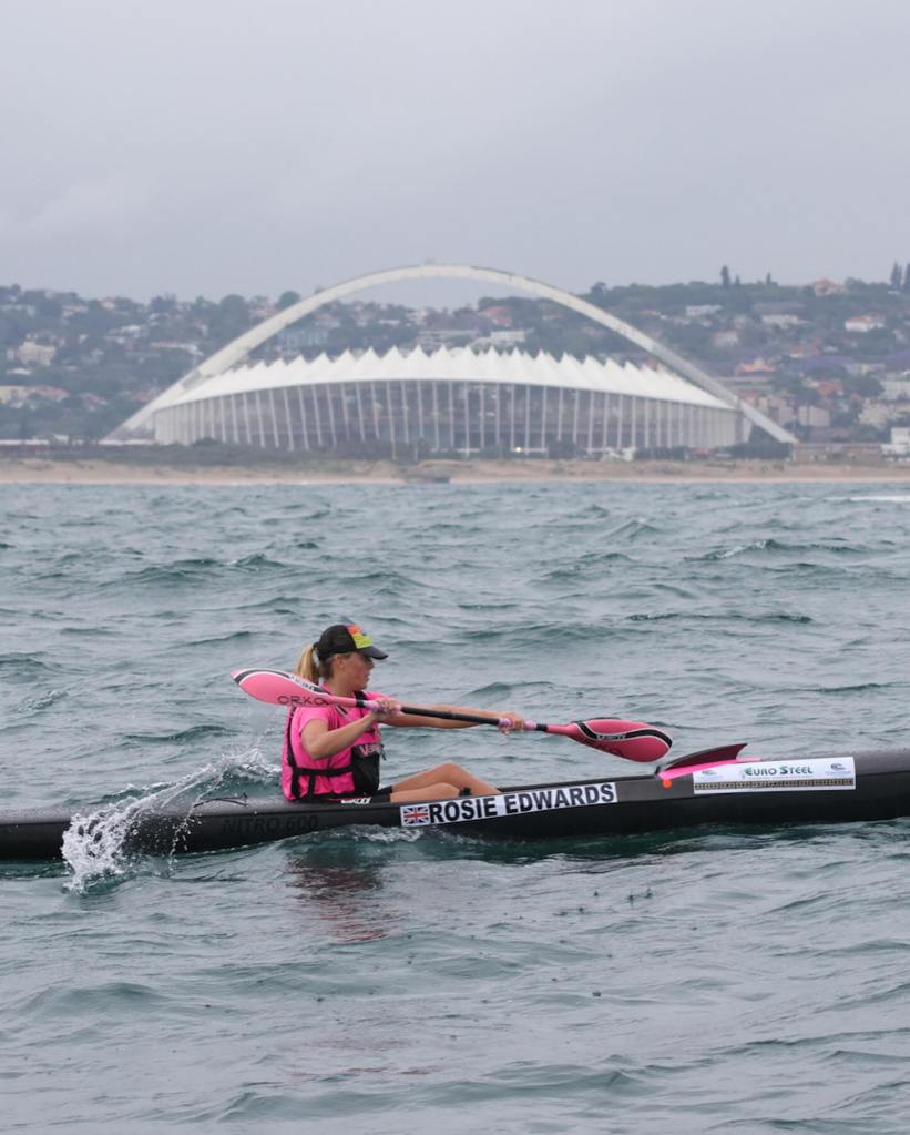 Rosie Edwards’ GB teammates erupt in surprise and excitement when they see her pink boat and hat crest in the Durban shorebreak to take 3rd place behind Kira and Dani, a personal and national best.