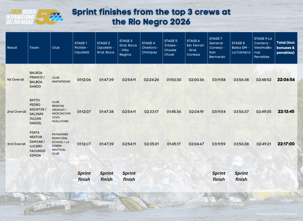 In marathon racing, the 50th edition of the Regata del Rio Negro started off the year with a bang. For 5 out of the 9 stages of the 415 kilometre race, the top 3 teams finished just seconds apart. In the end, it was the Balboa brothers – Franco Ivan & Dardo Antonio – who won the race with a combined time of 22 hours, 6 minutes, 55 seconds. Just six minutes behind them was the young crew of Pedro Agustin Ratto and Julian Daniel Salinas. Ratto and Salinas both raced at the World Championships in Gyor, Hungary last year, finishing 2nd and 4th respectively.